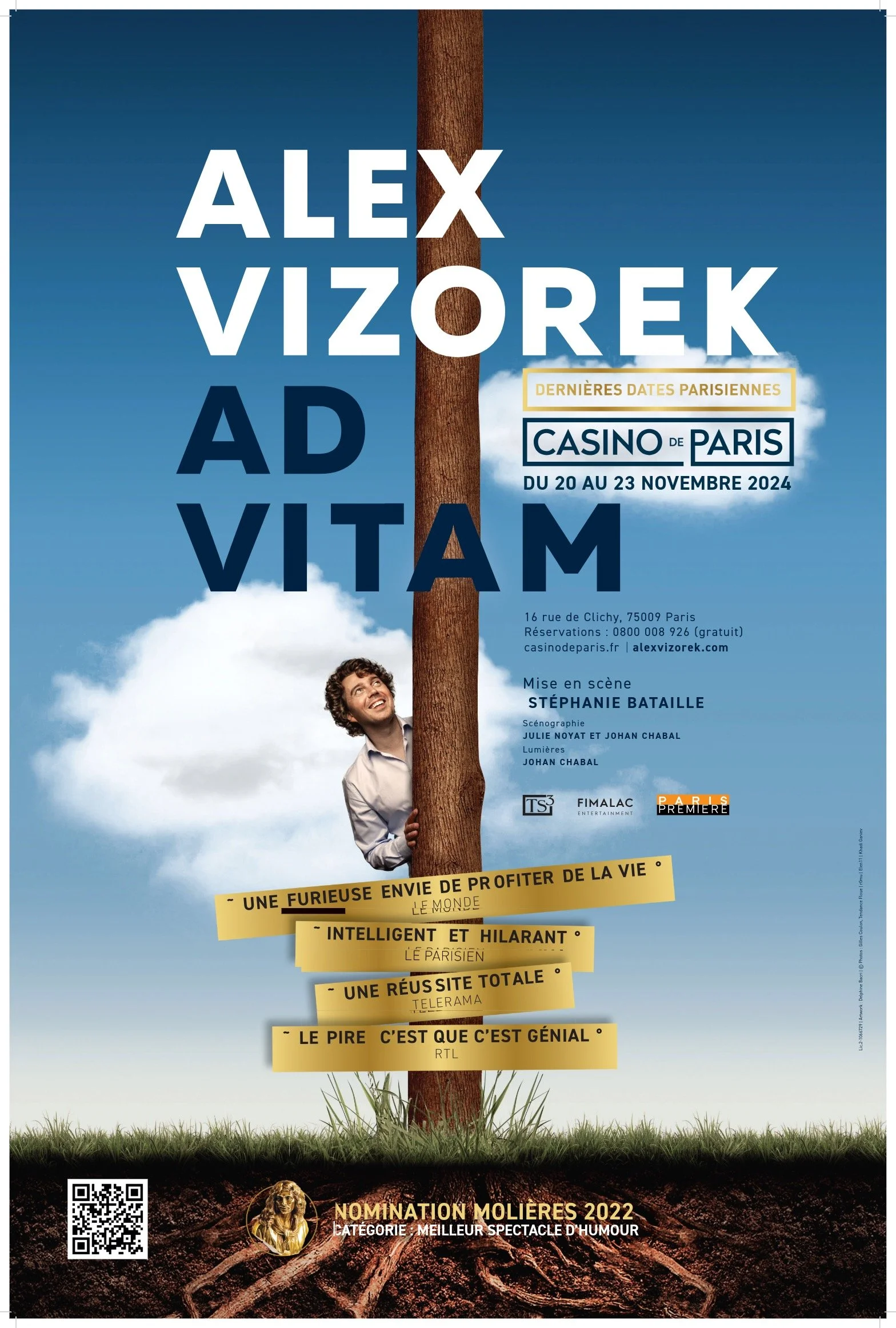 Alex Vizorek nous propose son nouveau seul en scène « AD VITAM ». Spectacle sur la… mort...partant du postulat que ça pouvait concerner pas mal de gens ! Il s’appuie sur la philosophie, la biologie, la culture et sans oublier l’orgasme: appelé aussi la petite mort, Alex Vizorek nous offre avant tout un spectacle sur la VIE.